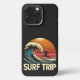 Ce design dynamique et éclatant représente un surfeur chevauchant une vague imposante, le tout encadré dans un cercle évoquant le soleil couchant. La palette de couleurs est riche, avec des bleus profonds, des oranges et des jaunes contrastants, créant une image frappante de la transition du jour à la nuit. Le thème saisit l’essence de l’aventure et l’esprit du surf, avec une typographie audacieuse en bas indiquant “SURF TRIP”