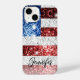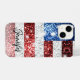 Personnalisez le faux coque iphone brillant avec votre élégant nom de script. Drapeau américain en parties scintillant rouge blanc et bleu faux scintillant. Nous utilisons des photos de parties scintillant étincelantes.