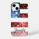 Personnalisez le faux coque iphone brillant avec votre élégant nom de script. Drapeau américain en parties scintillant de faux brillants rouge et bleu. Nous utilisons des photos de parties scintillant étincelantes.