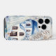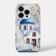 A vintage themed phone case that takes place in Mykonos, Greece that has one of the famous buildings, a sail boat, flowers, old cogs and has a newspaper background