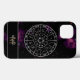 Un coque iphone zodiaque élégant et moderne, avec un calendrier astrologique circulaire avec un arrière - plan d'espace profond et une belle nébuleuse violette. Le cercle zodiaque montre tous les symboles et constellations de signes 12 étoiles. Un cadeau sur le thème de l’astrologie qui est facile à personnaliser, avec un espace pour un monogramme et un nom pour ajouter cette touche unique.