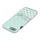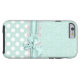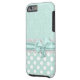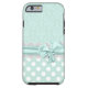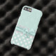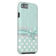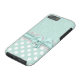Joli coque vert menthe et blanc iPhone 6, avec un vert menthe sur le motif vert damask, sur le dessus, et un vert menthe avec un motif de pois blanc, sur le fond. Des graphiques d'un groupe de dentelle blanche et d'un ruban vert menthe et d'un arc traversent le milieu entre les deux arrière - plans. Customisez d'ajouter votre propre texte. Excellente façon d'être élégant et de protéger votre téléphone en même temps.