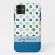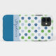 Protégez votre iPhone 5 dans ce joli coque. Avec un vrai look de fille fillette, cet coque est fait en blanc, avec un motif de pois vert et bleu, sur le dessus, et un bleu solide sur le fond du coque. Une bande bleue claire traverse le milieu, avec un texte de script bleu personnalisé. Personnalisez ce joli coque pour vous-même ou comme une excellente idée cadeau.