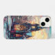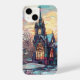 Un charmant mini iPhone 14 coque avec l'image d'une église d'hiver en vitrail.