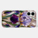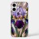Étui élégant pour iPhone présentant un superbe design d'iris de style vitrail dans des tons de pourpre riche, rehaussé de détails dorés doux et de feuilles vert foncé. La fleur centrale audacieuse crée un look raffiné et artistique qui se sent à la fois luxueux et intemporel.