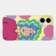 Design coloré, lumineux, abstrait d'un visage stylisé d'une fille aux cheveux rayés, avec un arrière - plan de cercles.