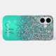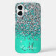 Parties scintillant IMPRIMÉE turquoise et argent bleu, personnalisée avec votre nom et monogramme. Faux vert acier brossé. Boîtier mobile iPhone 16.