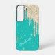 Ce boîtier téléphonique glamour a un arrière - plan de bleu aqua profond avec de minuscules éclats d'étoiles d'argent et d'or. Le dessus est recouvert de gouttes de fausse parties scintillant argentée. Votre nom est en écriture blanche en diagonale à travers le bas. Joli !