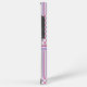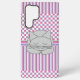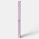 Une image d'un chat qui dort gris avec un sourire sur son visage contre un motif rose, violet et gris est un design unique pour les amateurs de félins.