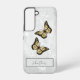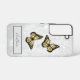 Chargez votre appareil électronique avec un Brilliant Gold Butterflies Samsung Galaxy Coque. Le design coque présente des papillons brillants reposant sur une vigne blanche florale contre un arrière - plan gris.