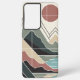 Geometric mountain landscape design combines clean lines and abstract shapes to create a modern, minimalist work of art. Inspired by the natural beauty of mountains, sunshine, and lakes, this artwork features a sophisticated earth color palette including warm terracotta, sage green, soft beige, and deep dark tones.