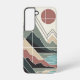 Geometric mountain landscape design combines clean lines and abstract shapes to create a modern, minimalist work of art. Inspired by the natural beauty of mountains, sunshine, and lakes, this artwork features a sophisticated earth color palette including warm terracotta, sage green, soft beige, and deep dark tones.