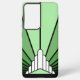 Un motif de style art déco classique, créé en vert. Un motif emblématique du soleil se levant derrière un bâtiment en forme d'art déco stylisé. Un design simple mais élégant, fidèle à l'époque.