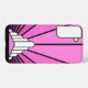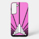 Un motif de style art déco classique, créé en rose. Un motif emblématique du soleil se levant derrière un bâtiment en forme d'art déco stylisé. Un design simple mais élégant, fidèle à l'époque.