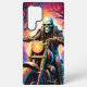 un squelette grippé dans un vélo de pandemonium. Il a un pantalon en cuir noir et des bottes de moto et une veste en cuir noir avec un design osseux sur la tenue de cale.Le soleil couchant derrière lui. La brume qui monte de l'entourage jusqu'à la nuit sombre, il s'éloigne avec des étoiles de nuit au-dessus.