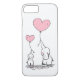 Mère mignonne de bande dessinée et éléphant de bébé tenant les ballons en forme de coeur roses dans leurs troncs.