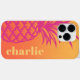 Boîtier de téléphone avec ananas rose chaud et votre nom ou texte personnalisé aligné verticalement à droite sur un arrière - plan dégradé jaune à orange.