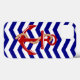 Ce design nautique dynamique présente une ancre rouge sur un motif rayé bleu marine et blanc chevron.