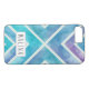 Aquarelle géométrique chevron rayures bleu et violet iPhone 7 coque. Ce design moderne se concentre sur les belles couleurs violet et bleu et l'aquarelle du motif rayé. Il est personnalisé avec votre nom dans un cadre.