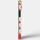 Un étui téléphonique personnalisé avec un style rétro arbre de Noël du milieu du siècle motif de triangles, étoiles, flocons de neige et bandes diagonales. Les couleurs comprennent : rouge, vert, rose et blanc. Ce design peut être personnalisé avec une initiale (monogrammed).