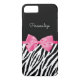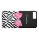 Une caisse noire et blanche à la mode de l'iPhone 7 d'impression de zèbre à peine là décorée d'une image d'un ruban chic de roses indien attaché dans un arc girly. Personnalisez cette conception rose et noire à la mode de poster de animal en ajoutant le nom de votre fille préférée. Image imprimée d'appartement, arc non réel.
