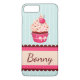 Téléphonez le cas avec le petit gâteau et la cerise roses sur l'arrière - plan rayé bleu en bon état.