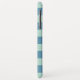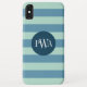 Habillez et protégez votre iPhone avec un motif rayé de style marin classique avec un élément de conception circulaire qui est personnalisé monogrammed avec vos initiales premier, milieu et nom de famille dans une police Serif élégante. Couleurs bleu marine.