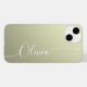 Beige Shimmer Blanc Élégant Script de calligraphie personnalisée Nom iPhone 14 Smart Phone Boîtes dispose d'un design moderne et tendance simple et élégant avec votre nom personnalisé dans élégante écriture calligraphie script typographie sur un arrière - plan métallique beige shimmer. Conçu par ©Evco Studio www.zazzle.com/store/evcostudio