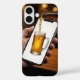 La main d'un homme tient un smartphone montrant l'image d'une tasse de bière, tandis que la bière est versée d'une bouteille dans la tasse