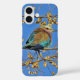 Pretty, colorful bird sat on a tree branch with a bright blue sky backdrop.