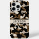 Customize this black and brown camouflage iPhone 15 pro case with your name in a trendy modern CAP font in black on cream. It's masculine and perfect for your favorite military, hunting, country or outdoorsman!
