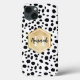 Motif élégant Dalmatien taches avec un faux étiquette de feuille d'or avec nom personnalisable et modèles monogrammes. Un joli coque monogrammed iPhone 13 avec des taches noires et blanches motif et des éléments dorés. Pour modifier les couleurs et les styles de police, cliquez sur le bouton "personnaliser", puis cliquez sur le bouton "customiser plus loin".