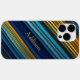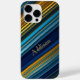 Bleu/Or Abstrait Grilles Coque-Mate iPhone 14 Pro Max Coque. Ce boîtier téléphonique abstrait moderne en or et bleu rayures iPhone 14 est parfait pour tous ceux qui admirent les couleurs et les lignes classiques, mais avec une présentation tendance. De plus, cette conception peut être facilement transférée à un autre coque iphone si désiré. Votre nom et votre choix de polices peuvent être facilement insérés à l'aide de l'outil de conception de Zazzle.
