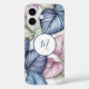 Un motif de feuilles bleu, vert et lavande avec votre monogramme initial dans un cercle fait un joli étui téléphonique personnel.