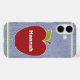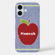 Coque iphone de professeur de Whimsical, fait dans des graphiques qui ressemblent à du jean bleu. Graphiques colorés d'une grande pomme rouge, au milieu, et lignes colorées bordent le haut et le bas. Texte personnalisé blanc, sur la grande pomme est prêt à personnaliser pour lire tout ce que vous voulez.