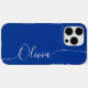 Blue White Elegant Calligraphy Script Custom Personnalisé Nom iPhone 16 Pro Max Smart Phone Boîtes dispose d'un design moderne et tendance simple et élégant avec votre nom personnalisé dans élégante calligraphie manuscrite typographie sur un arrière - plan bleu. Conçu par ©Evco Studio www.zazzle.com/store/evcostudio