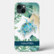Ce boîtier téléphonique personnalisé est doté d'une tortue de mer aquarelle, d'un littoral et de feuilles de palmiers tropicaux de monstère. Personnalisez avec votre nom en blanc sur un arrière - plan bleu marine. Oeuvre et design de Victoria Grigaliunas. Pour voir plus de cas de vie marine et de téléphone de plage comme cette visite www.zazzle.com/dotellabelle