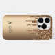 Un coque élégant, féminin et glamour. Faux parties scintillant de bronze goutte à goutte, la peinture goutte à goutte. Cuivre, faux or foncé arrière - plan à l'apparence métallique. Personnalisez et ajoutez votre nom écrit avec un script de style manuscrit. Lettres de couleur Brown.