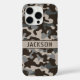 Customize this brown and gray camouflage iPhone 16 pro case with your name in a trendy modern CAP font in brown on taupe. It's masculine and perfect for your favorite military, hunting, country or outdoorsman!