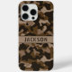 Customize this multi-hued brown camouflage iPhone 15 pro max case with your name in a trendy modern CAP font in dark brown on light brown. It's masculine and perfect for your favorite military, hunting, country or outdoorsman!