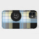 Cas de l'iPhone 5 de monogramme conçu avec un motif génial de plaid dans bleu, jaune, et noir, et personnalisé avec votre initiale dans le blanc au-dessus d'un cercle noir.