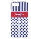 Rayures modernes décorées d'un monogramme rouge, blanc, et de bleu marine avec le cas de l'iPhone 7 de motif de pois.
