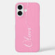Pink Elegant White Calligraphy Script Personnalisé Nom iPhone 16 Smart Phone Boîtes dispose d'un design moderne et tendance simple et élégant avec votre nom personnalisé dans élégante calligraphie manuscrite typographie de script sur un arrière - plan rose. Conçu par ©Evco Studio www.zazzle.com/store/evcostudio