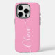 Pink Elegant White Calligraphy Script Personnalisé Nom iPhone 16 Pro Smart Phone Boîtes dispose d'un design moderne et tendance simple et élégant avec votre nom personnalisé dans élégante calligraphie manuscrite typographie de script sur un arrière - plan rose. Conçu par ©Evco Studio www.zazzle.com/store/evcostudio