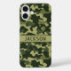 Personnalisez cette coque iPhone 16 plus au camouflage vert multicolore avec votre nom dans une police CAP moderne et tendance en vert foncé sur fond vert clair. C'est masculin et parfait pour votre militaire, chasseur, amateur de plein air ou de campagne préféré !