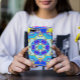 Cette fleur de mandala funky est décorée de bleu, jaune et rose dans un style de dessin animé. Des visuels géométriques trippy pour l'hippie moderne ou amoureux de couleurs vibrantes!