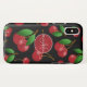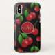 Cerises sucrées iPhone X coque robuste avec un motif coloré de cerises uniques aléatoires et jumelées avec des tiges et des feuilles encore intacts sur un arrière - plan noir personnalisable - personnaliser avec son nom et monogramme - par katz_d_zynes