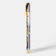 Ce coque iphone festif et amusant comprend un cheval de quart noir avec un harnais orange qui vous regarde à travers la fenêtre de la cuisine. La fenêtre se dresse sous lui et le mur gris aussi. Vous pouvez voir les feuilles d'automne jaunes sur l'érable devant la fenêtre.