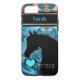 Une silhouette d'un cheval' ; tête sur un arrière - plan psychédélique bleu avec un coeur aqua/noir et le mot " ; Cheval" ; . Avec une bande noire et or personnalisable avec votre nom. Le cadeau parfait pour votre amoureux du cheval.