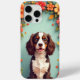 Chien assis adorable avec une expression joueuse. Ce chien a un pelage riche brun et blanc, caractérisé par des oreilles duveteuses et des yeux expressifs qui dégagent de la chaleur et de l'amitié. Autour du chien se trouve un cadre floral vibrant composé de fleurs orange, rose et jaune, ainsi que de feuilles vertes, sur un fond bleu doux.